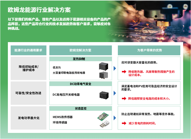 在能源行業新產品,除上期介紹的G9KA、G7EB、G9KB、G7L-X、G2RG-X、G5PZ-X等6個系列功率繼電器,還有以下產品方案: