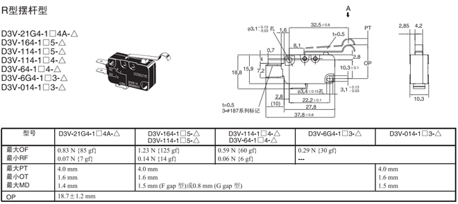 | R型擺桿型 | 內部安裝 | 0.83N {85gf} | D3V-21G4-1□4A-△ | D3V-21G4-2□4A-△ | D3V-21G4-3□4A-△ |