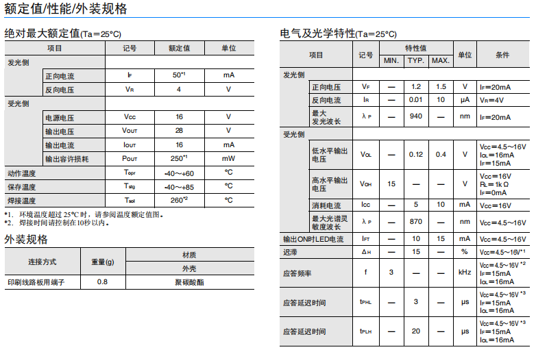 橫向安裝凹槽端子型(槽寬:2mm) 橫向孔徑 印刷線路板用端子 適用電源電壓為 DC4.5~16V 光電IC輸出(入光時ON) 可直接連接 C-MOS