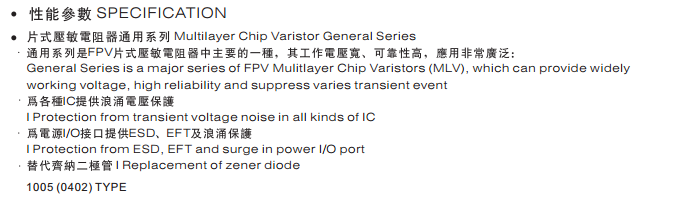 特征: 1、疊層片式陶瓷結構。 2、無引線。 3、溫度范圍:-55℃~+125 ℃。 4、工作電壓范圍V w(dc)=3.3~ 615V。 5、具有雙向限制特性,適合ESD保護。 6、漏電流非常小。 7、寄生電感小、響應速度快(響應時間少于0.5ns)。 8、優良的溫度系數。 9、良好的焊接性能(端電極為三層電鍍)。 應用: 1、防止過電壓:當施加的電壓升高到壓敏電壓時,壓敏電阻器的電流急劇上升,被保護設備的浪涌電壓迅速減小,從而使裝有壓敏電阻器的設備抗浪涌噪聲能力達到相應要求。壓敏